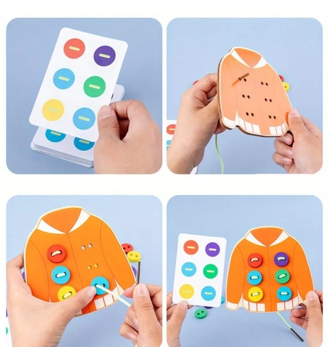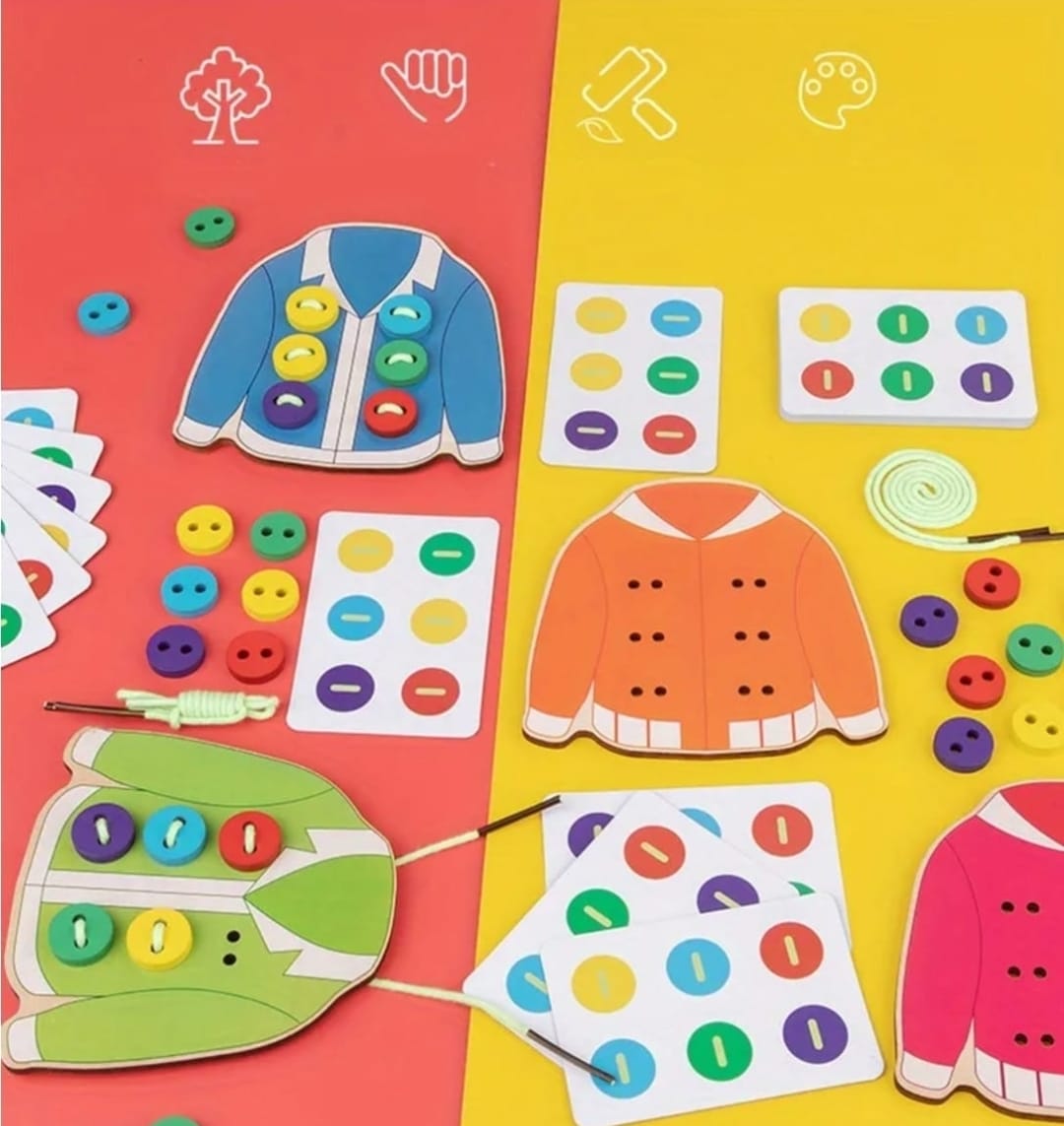 Descubre las Chaquetitas con Botones, un juguete divertido que imita una chaqueta real. Los niños pueden practicar su destreza al insertar la cuerda a través de los agujeros de los botones y pegarlos en la chaqueta. Ideal para desarrollar habilidades motoras finas mientras juegan y aprenden. ¡Una forma entretenida de aprender a abotonar!